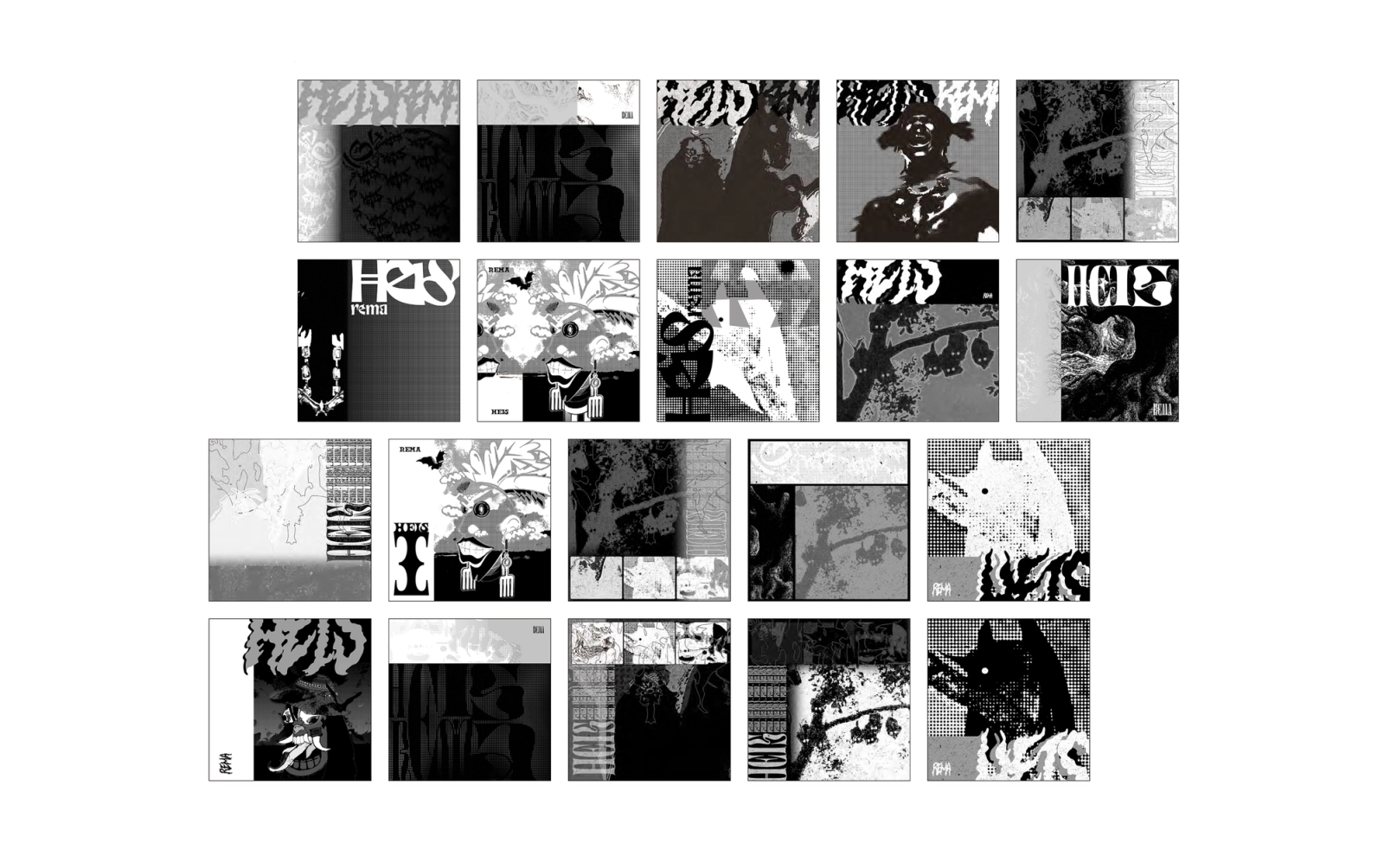 The exploration phase wasn't a search for the right image, it was a search for the right density. Each test asked the same question differently: where does the black sit, what does the grey hold, and how much white is needed to let the page breathe. The final compositions emerged from that calibration.